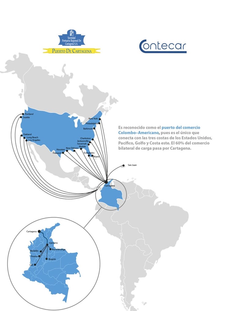 Actualmente, atiende 25 líneas navieras y está conectada con 850 puertos en 140 países alrededor del mundo. Este alto número de líneas directas se traduce en enormes ventajas competitivas tanto para los importadores y exportadores colombianos, como para las compañías internacionales que hacen transbordo en el puerto. Su desarrollo estratégico en el entorno del comercio internacional marítimo han hecho del Grupo Puerto de Cartagena el puerto por excelencia del comercio Colombo Americano.
