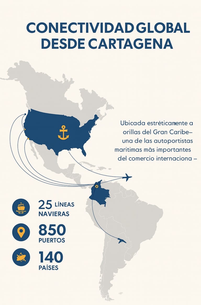Cartagena es reconocida como la puerta de América. Sus condiciones portuarias están a la altura de los mejores puertos del mundo, con una infraestructura moderna, digitalización avanzada y una eficiencia operativa de clase global.